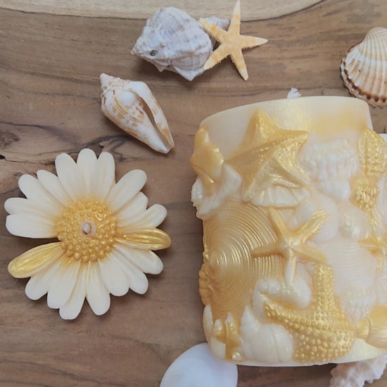 Ici nous avons colorier certains coquillages avec un pinceau fin avec de la poudre de mica qui reste un produit naturel pour donner une certaine profondeur à certains coquillages.